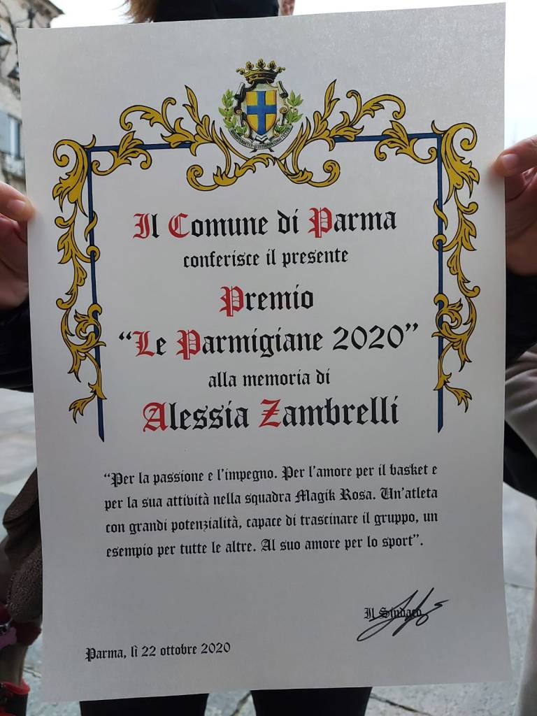 A ricevere il Premio dalle mani del Sindaco Federico Pizzarotti e dell’Assessora alle Pari opportunità Nicoletta Paci sono state l’atleta Elisa Adorni e le atlete della squadra di Sitting Volley. Inoltre è stato istituito un Premio alla memoria, che, quest’anno viene dedicato all’atleta Alessia Zambrelli, brillante atleta nel basket militante nella Magik Rosa Parma.